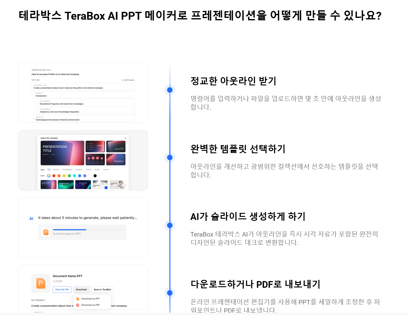 머릿속에 떠오르는 무한한 아이디어를 어떻게든 PPT로 실현하고 싶다면, 테라박스 AI가 꼭 필요한 도구가 될 것입니다. 오늘은 ppt 생성 ai를 통해 우리가 겪는 다양한 상황에서 얼마나 편리하고 효율적으로 발표자료를 만들 수 있는지에 대해 살펴보려고 합니다.