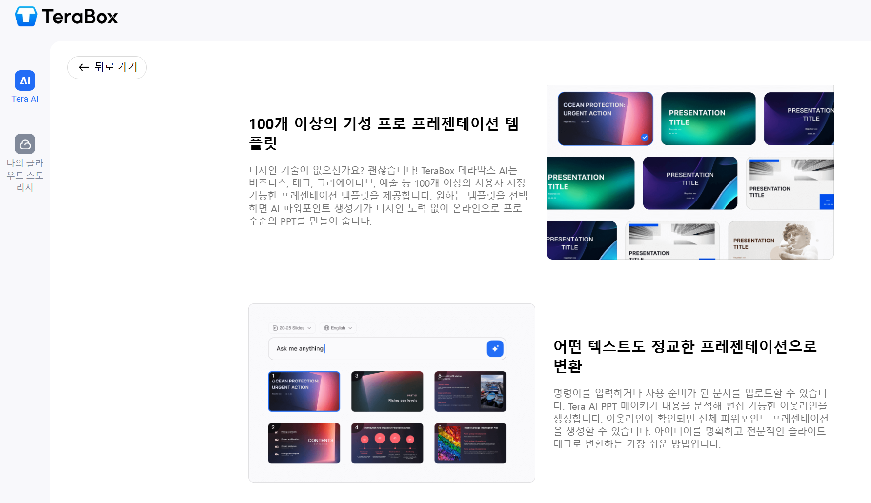 테라박스에서 제공하는 AI PPT 만들기는 사용자 친화적인 인터페이스를 통해, 손쉽게 ppt 생성 ai를 이용할 수 있습니다. 사용자는 간단한 지시만으로도 AI를 통해 원하는 발표자료를 만들 수 있습니다. AI는 사용자의 요구를 이해하고, 그에 맞는 슬라이드를 생성해 줍니다. 이는 발표 자료 제작 과정을 훨씬 간편하고 효율적으로 만들어줍니다.