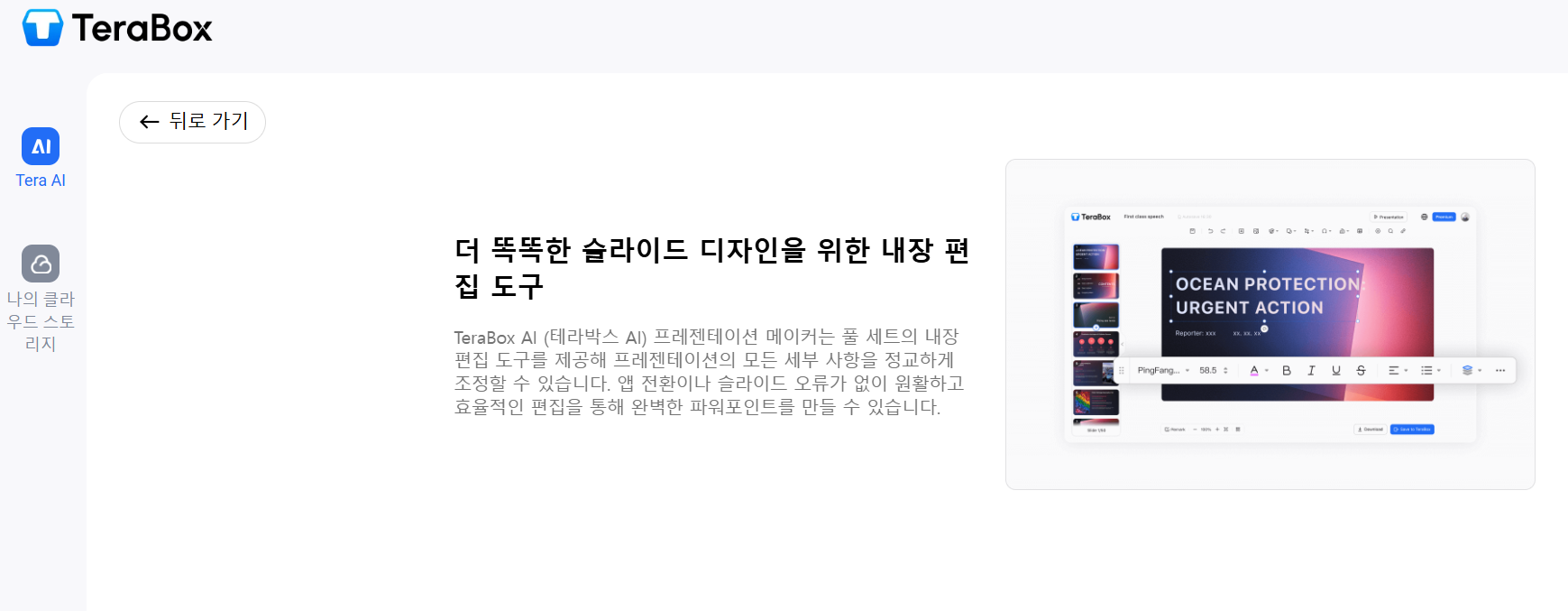 피피티 만들어주는 ai, 즉 테라박스 AI PPT는 마케팅 자료를 준비하는 데 있어서 혁신적인 도구입니다. 이 AI는 사용자의 요구에 맞게 피피티를 생성하고, 시각적으로 뛰어난 결과물을 만들어 냅니다. 이는 마케팅 전문가나 디자이너가 아니더라도, 자신만의 고품질 피피티를 만들 수 있게 해주는 것입니다.